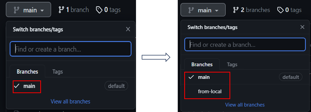진행 후 github으로 이동하여 branches를 확인해보면 이와같이 from-local 브랜치가 추가되어있다.