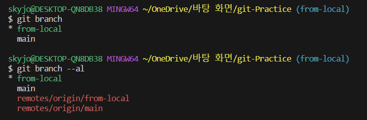 위의 명령어를 진행한다면 지금 로컬에서 from-remote브랜치에 위치한 것을 확인할 수 있다.