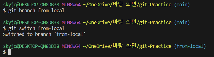 진행 후 github으로 이동하여 branches를 확인해보면 이와같이 from-local 브랜치가 추가되어있다.