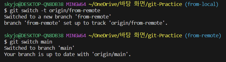 원격 브랜치는 로컬로 받아오기위해 해당 명령어를 사용하는데 여기서 -t 는 origin/from-remote에서 local로 from-remote이라는 브랜치를 복사한 다음에 이후로도 계속 로컬에서 from-remote와 연결하겠다는 의미이다.