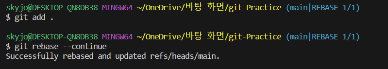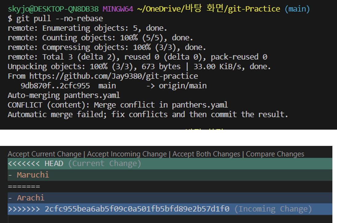 - Pull하여 충돌 상황 마주하기 (--no-rebase와 --rebase 모두 시도해볼 것)