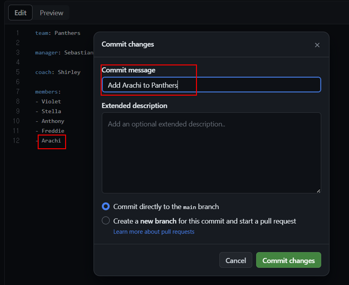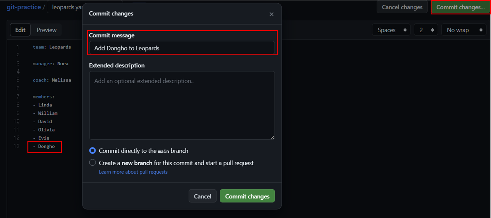 로컬 저장소에서 Leopards의 members에 Evie를 추가하고 커밋 메시지를 작성해보겠습니다.