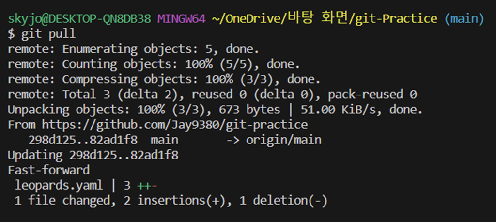 별다른 문제 없이 pull이 완료되면 원격에서 수정한 내용이 로컬에도 적용됩니다.
