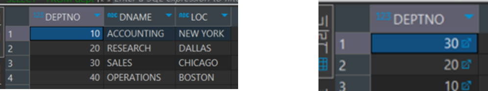좌측의 경우 Dept 테이블을 조회 한 결과이고, 우측의 결과는 emp테이블에서 deptno를 조회한 결과이다.