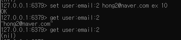 # 10초 후 자동 삭제 set user:email:3 hong3@naver.com ex 10- ex = expire (초 단위)