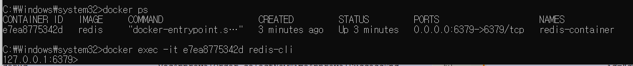 # 이름으로 접속 docker exec -it redis-container redis-cli # ID로 접속 (앞 3~4자리만 유니크하면 OK) docker exec -it e7ea redis-cli